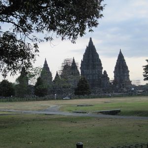 プランバナンはその鋭角的な建造に圧倒される。夕景が美しく、遠くにジャワ富士を望む。