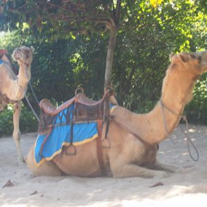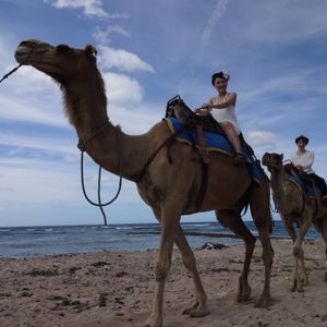 ハネムーンの記念に利用させていただきました。ゾウに乗ってブライダルフォトというオプションをヒントにらくだに乗ってブライダルフォト風にしようと、白いドレスに髪に花をつけて写真を撮りました。ニッコーバリの素敵なホテルの専用ビーチにあり、優雅な気分でらくだ乗り場まで案内されました。らくだはおとなしくて乗り心地も良かったです。砂漠みたいにしてある所と海がきれいなところとあり、うまく撮っていただけました。30分で丁度いいです。それ以上だと日焼けが心配だし、飽きると思います。