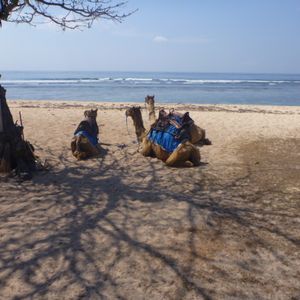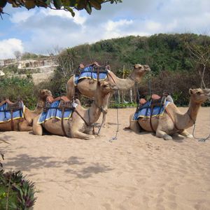 以前タイで象に乗ったことがあるので、まぁ似た様な感じだろうと思っていたのですが、ヌサドゥアの美しいビーチをらくだに乗って散歩するのは想像以上に気持ちがよくロマンティックでした。座った状態のらくだの背中に乗り、らくだが立ち上がる瞬間がとても面白いです。バリ人ガイドさんは、日本語が上手で日本のギャグを驚く程知っています。楽しい方で、らくだに乗っている間ずっとお喋りしていて全然退屈しませんでした。カメラを預けておくとたくさん写真を撮って下さいます。途中休憩してドリンクを頂き、来た道を戻るのだけなのですが、広がる美しい景色・ガイドさんのトークのおかげで夫婦で大満足でした☆