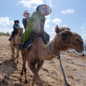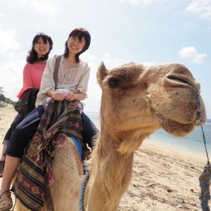 らくだのこぶに乗ると急に立ち上がり、まるでひざかっくんのような感触です。立ち上がると高さもあり気持ちも大きくなります。歩き出すと白いビーチに青い海。気分は砂漠を旅する王のよう。最高でした。