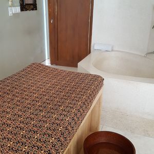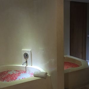 ボディーローションを塗り、20分放置。ローションは草の匂いでナチュラルな感じでした。ひんやりして、火照った身体にとっても馴染みがよい気がしました。お隣のお部屋に移動して、はちみつを身体に塗り、シャワーを浴びました。そして、フラワーバス!お友達と2人で入る感じでした。上半身裸に紙パンツを履いていて変な感じで笑っていました。フラワーバスにつかりながら、スタッフさんが用意してくれた、スイカジュースとクッキーで乾杯。15分間のフラワーバスを楽しみました。これはカップルにオススメかも!2人の距離がグッと縮まりますよ!そして、部屋に戻ると新しいガウンが用意され着替えて今度はヘッドスパ。上からオイルが落ちてくるマシーン?みたいなものがくすぐったくて気持ちよかったです!マッサージ師さんの手加減が私にはとっても居心地がよく、気がついたら夢の中でした。私のお友達も寝ていた様子でした。最後に部屋移動をし、シャンプーとリンスとまたヘッドマッサージ!鏡で見ると自分の顔がすっきりしていてとても気持ちがよかったです。ブローとドライヤーまでしてもらい、髪の毛本来のツヤを取り戻しました!とっても充実した3時間で終わるのもあっという間でした。またバリ島に訪れた時にはこちらのサロンを使わせて頂きたいと思っています!何しろ、他のお客さんとすれ違うこともなく、貸切気分でリッチな雰囲気でした。充実したプランで参加してとってもよかったです!参加する際はすっぴんで行ったほうがいいです!ぜひ皆さんも参加することをオススメします!ホテル間の送迎のお兄さんもとっても優しい感じでよかったです。