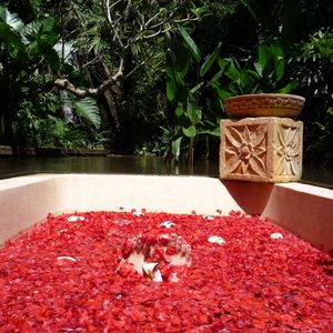 こちらでもフラワーバスも体験したのですが屋外のお風呂ですぐ側ではラフティングでエキサイトしている声が聞こえたり、人工的ではありますが小さな滝が流れていて自然を満喫できる作りになっていましたフラワーバスのお花の量もたっぷり、湯加減も調節できましたし、入浴中に出された飲み物とテンペ(軽食)がすごく美味しかったです。
