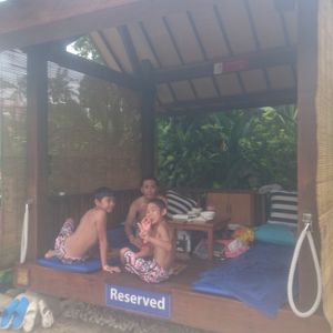 初めてのバリ旅行で行ってきました。子連れ向けの施設をこちらで検索したところ、皆さんのレビューの高いWaterBomをチョイス。送迎なしのガゼボ付きプランにしました。送迎なしでも全く不自由ありませんでした。