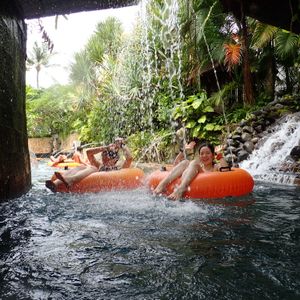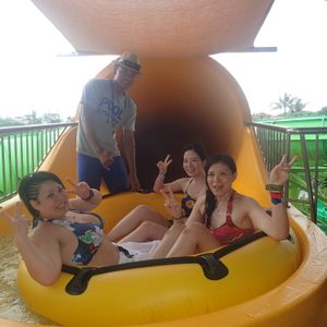卒業旅行で4人で申し込みました。ホテルに迎えに来てくださった現地のガイドさんに、少し早めの時間を帰りの時間としてお願いしたら、快く引き受けてくださりました。ウォーターボムに着くと、スタッフと私たちの間でやり取りをして下さり、施設の利用方法など詳しく理解することができました。9時すぎに到着し、11時ごろまでは利用客が少なく、スライダーは待たずに何回も乗れましたが、お昼過ぎから混み始めたため、スライダーなど中心に乗りたい方は、午前中に到着したほうが良いと思います。お昼ご飯はフード、ドリンク1つずつ無料で選べることができ、ガゼボに運んでいただきました。4人で利用しましたが、4人でちょうど良い大きさでした。2〜4人用だと思います。セキュリティボックスの大きさもちょうどよく、財布、携帯、Tシャツなどは入るため、ロッカーは借りずにガゼボに荷物を置いて遊びに行きました。施設が思った以上に綺麗で、トイレや着替え室もとても綺麗で驚きました。現地のガイドさん、担当がNORAJAさん(ノラジャーさん)だったのですが、(スペルが合っているかわかりませんが...)車内でたくさんお話しできて、優しい方で、とても楽しいプランでした。初めてのバリ島で不安がある中、NORAJAさんに案内していただいて感謝の気持ちでいっぱいです。ぜひウォーターボムにもう一度訪れる際には、こちらで申し込もうと思います。ありがとうございました。