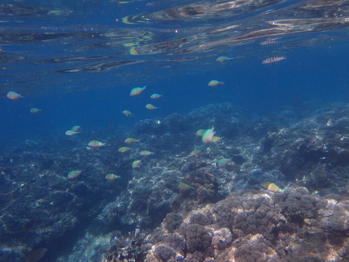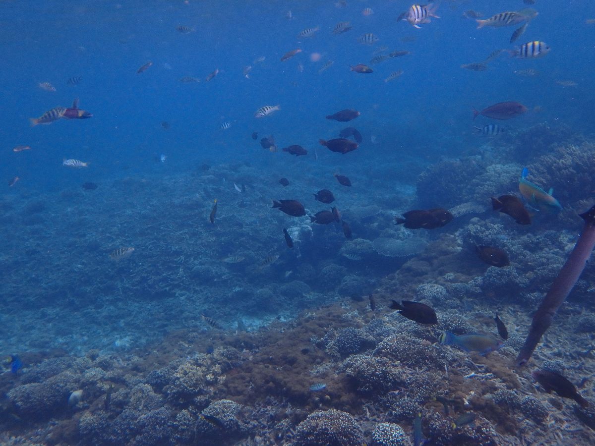 シュノーケリングでは浮き輪に捕まって 引っ張られているだけなのですが 、小さな魚がたくさん集まって来て癒やされました。