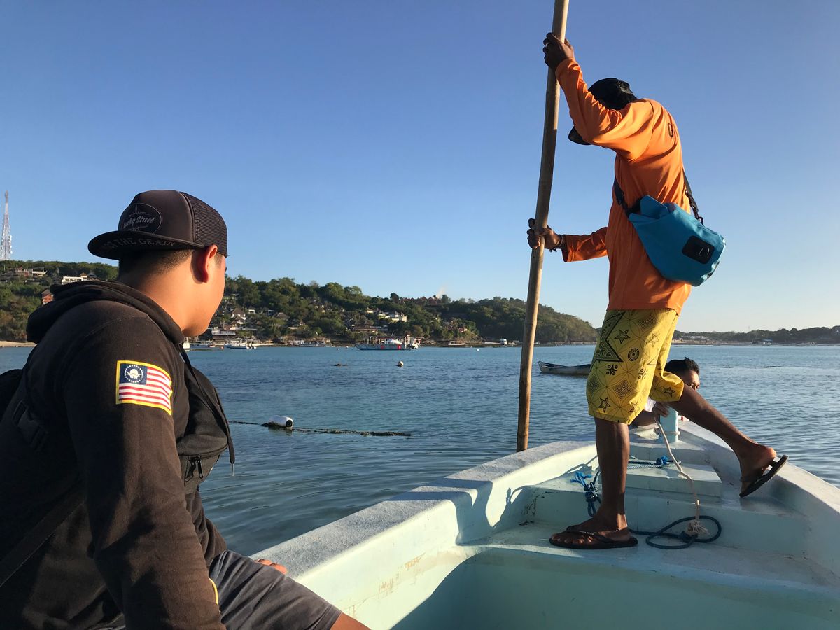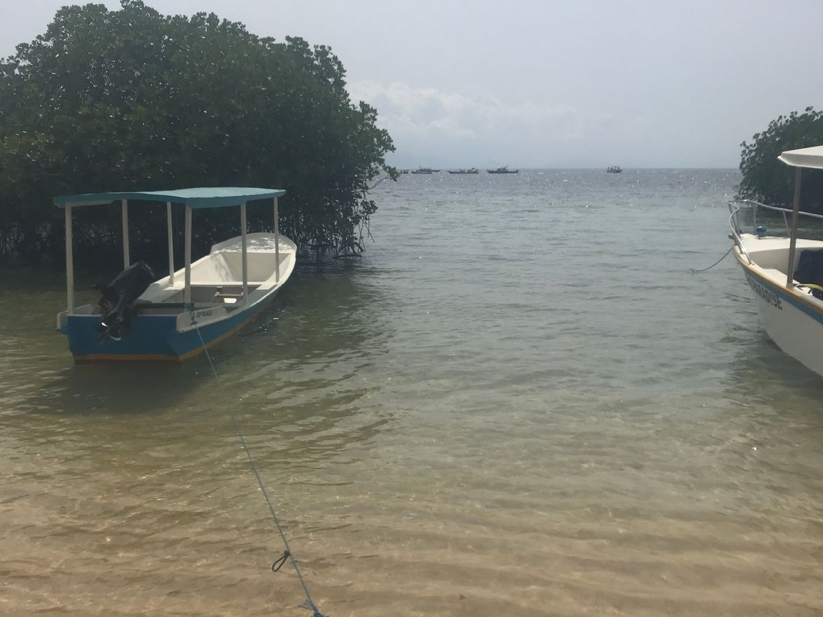 帰りは潮が引いて大型の船が入ってこれず、小型ボードで沖に止まってる船のところまで移動しました。