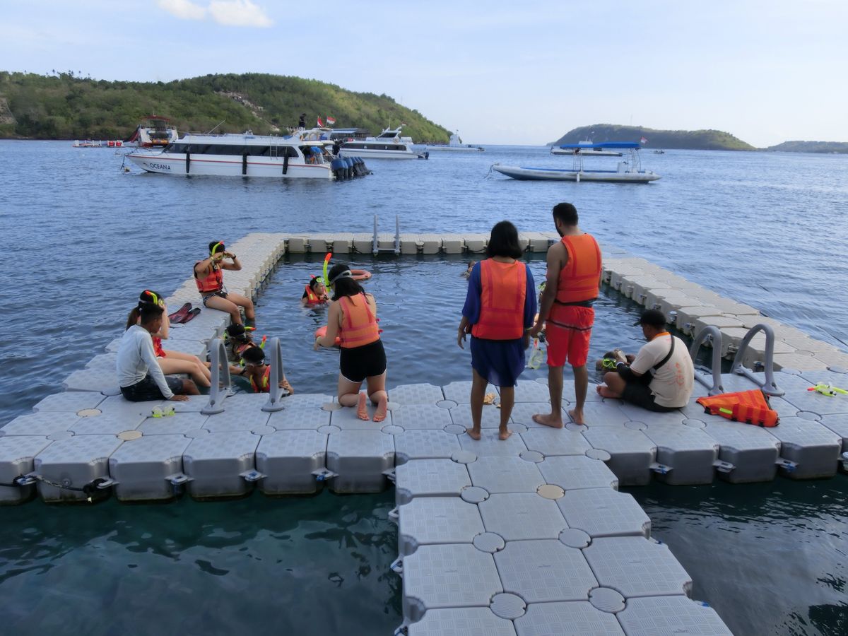 ペニダ島の桟橋(ここは波が穏やか)に戻って,ゆっくり昼食をいただいた後に,沖の大型船まで小型船で連れてもらい,浮きで囲われた囲いの中で,スノーケルを安心して,スタッフをマネしながら自分で餌付けしつつ,お魚観賞を楽しむことができました。また,時間ぎりぎりまでシーカヌーで走り廻り(ただし船の航路に入らないよう注意が必要。遊んでいたら,岸から随時,スタッフの大声が飛んできて分かりました),お手軽マリンスポーツ(たぶん子供でも大丈夫)が楽しめました。