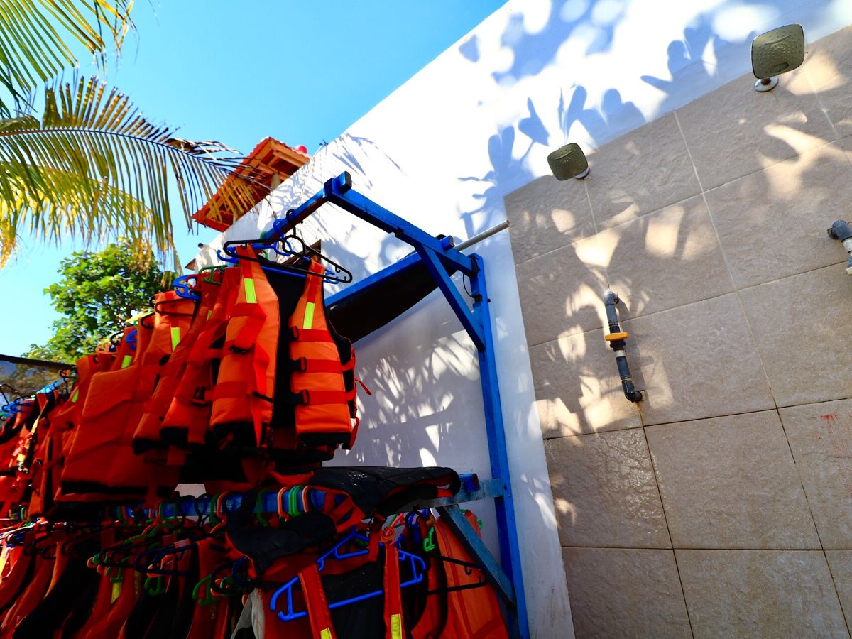 出発前にはまずフィン、ウェア、シュノーケルのサイズ合わせ、