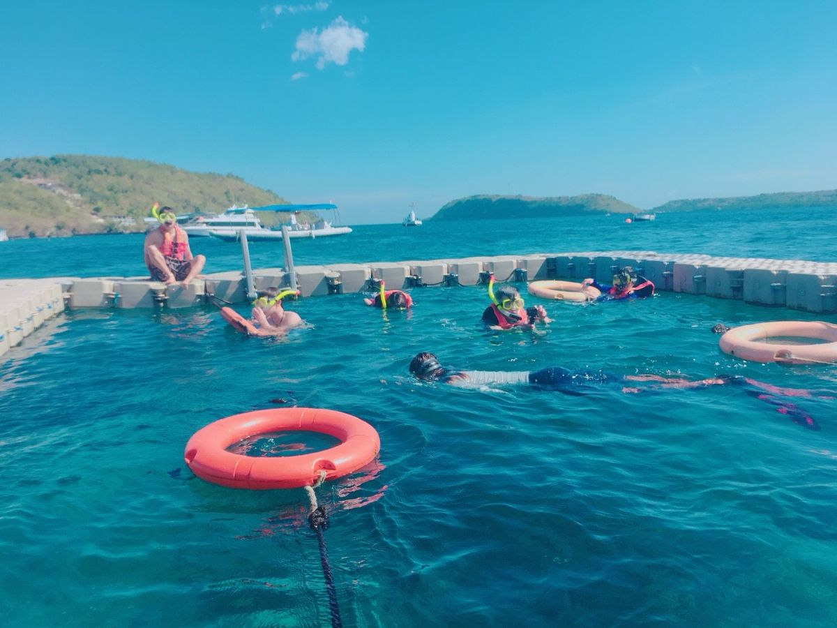 その後シュノーケリングするために水着に着替えました。(ロッカー代、バスタオル代それぞれ10000Rpかかります。ロッカーはシェアしてもOK!着替え個室とシャワーは無料)ボートで移動して囲いがある生簀のようなところで50分くらいシュノーケリングができます。私は泳げないのですが、救命べストでうつ伏せでプカプカしながらゴーグル越しに海の覗くだけでも楽しめました!海の透明度も高くすぐ近くでたくさんの綺麗な魚たちが泳いでいるのを見るだけで楽しい^^ガイドさんがついてきてくれるので海に潜ってる間の貴重品管理も安心できます。