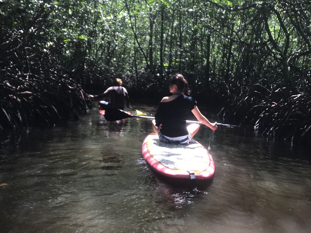 このツアーではコースがいろいろ選択できると思うのですが、人並みに体力があり、動くことが好きなひとならば、船に乗ってマングローブを周るよりも、パドルボートに乗って自分の力で漕いで周るほうをおすすめします!というのも、私自身が学生で、おとなしく船に乗るよりも落ちそうになりながら漕ぐパドルボートのほうがハラハラして楽しかったからです。ただ、マングローブの中は透き通った水ではないので、きれい好きなひとでそこに落ちたくないひとは船で回ったほうが良いかもしれません。でも難易度はそこまで高くないと思うので、無茶をしない限り海へ落ちることはないと思います。