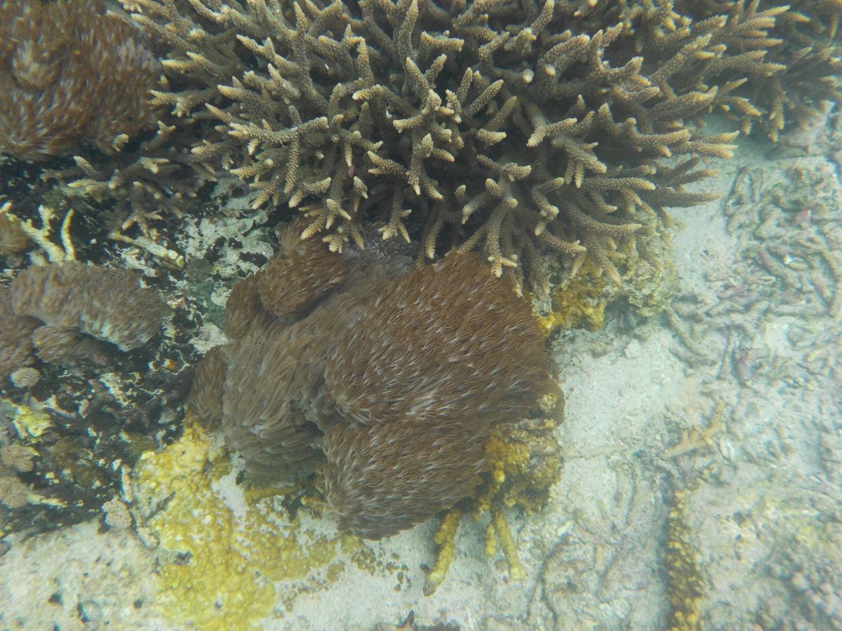 その後、ダイビング。この時間は私たちだけで、インストラクターの方にプールで耳抜きとか呼吸の仕方とかを丁寧に教えてもらいました。日本語もとても上手です。あと、約5000円くらいで水中の写真、動画を撮ってもらいました。終わった後USBをくれます。最初、どうやって使うかわからなかったけど、なんとか見えました。海中ではロープをたどって少しずつ深い所へ潜り、潮で流されそうになるとちゃんと手を繋いでくれたり、支えてくれたり全く不安はありませんでした。友達の方が大変だったのでインストラクターの方も友達に付きっ切りで、私はわりと自由に泳がせてもらいました。海底の砂を触ったり、魚やイソギンチャクに触れたり、サンゴを間近で見たり、そしてたくさん写真を撮ってもらって、30分の予定ですが、50分くらいは潜っていたんじゃないかな?本当満喫できました!