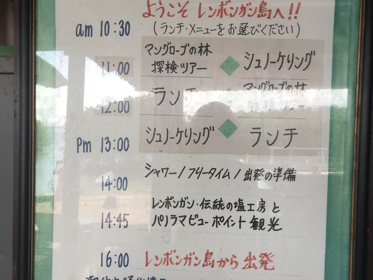 レンボンガン島に着いてからは、何時から〇〇をやりますとか、次に〇〇をやりますのアナウンスは、すぐにあるわけではなく、こちらから聞くと答えてくれるという感じで現地のガイドさんも、いい意味でマイペースです。ゆっくりとした時間が流れてる感じ。時間通りに動きたい人には、ちょっとイライラするかも...他のグループの、お子さん連れの方も、子供が「まだー?」とか、「いつになったら始まるの?」と話していました。待ち時間結構あります。シュノーケリングやマングローブツアー自体は海も綺麗で、シュノーケリングでは、たくさんの魚が観れて、マングローブも、自分でカヌーを漕いで