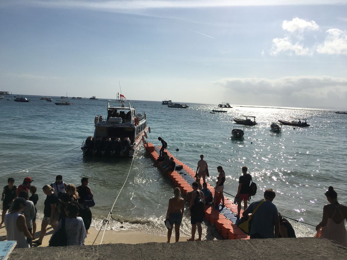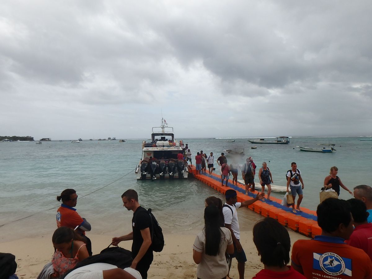 まずはクタのホテルから20分くらいの船着き場から船に揺られること1時間程度。波がかなり高いのでかなり揺れます。。。よわい方は酔い止めを持参した方がいいでしょう。帰りは島の売店のスタッフに酔い止めを売ってるかを聞いたら親切にも無料で貰えました。