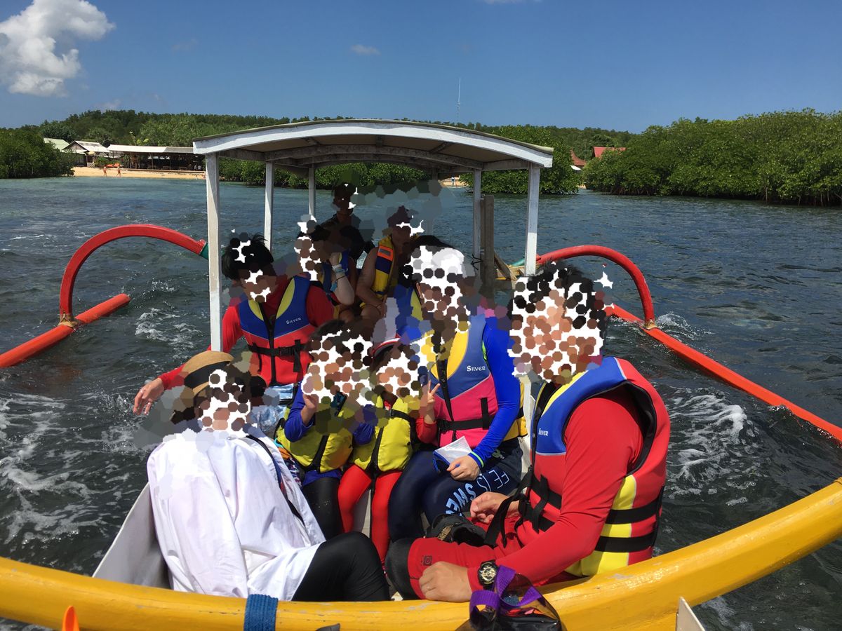 両親とともに昼食付き、バナナボート、シュノーケリング、スライダーを楽しめるというツアーに参加しました。色々なツアー会社があり悩みましたが、決め手はモニターでツアーの感想を書くと一人分の料金が無料になるので、それにつられて申し込み。結果、ここにしてよかったと思っています。朝、時間になるとホテルまで送迎がきてくれ、フェリー乗り場まで移動。乗り場には各国それぞれ人がいます。フェリー乗り場で受付をするのですが、私たちが日本人だと分かると、日本語のパンフレットを用意して1日の流れを説明してくれたので、英語が苦手という人も安心してください。船に乗り込むと朝食が用意されています。コーヒー又は紅茶、小さなパウンドケーキを食べますが、船酔いをしないために量は少ないです。フェリーが出航すると外で生バンドの演奏が始まり、到着までの45分優雅なひと時を過ごしました。到着15分前になると屋上デッキでシュノーケリングの使用方法について説明があります。説明は英語ですが、ジェスチャーでみんながわかるように説明してくれました。なので初めてシュノーケリングをするという人も安心です。そしてようやく海に到着!その日は雲が多く少し肌寒かったのですが、やはり海は透き通っていて綺麗でした。到着すると貴重品をロッカーを入れてスライダーをしたり、バナナボートに乗ったり、シュノーケリングをしたりして楽しみました。貴重品の出し入れは自由で腕に鍵だけつけて入れば良いのでとても身軽です。シュノーケリングではお魚の群れを見つけてやっぱり海が綺麗だなと思いました。11時半から14時頃まで船内のレストランで自由に食事がとれます。私たちはお腹が空いていたので、時間になるとレストランに直行。ナシゴレンやミーゴレンなどのインドネシア料理に加えて、カレーやサラダ、ケーキなどのデザートも充実していました。午後からは小さい船に乗ってレンボンガン島のお散歩ツアーに参加。砂浜が白くて綺麗でした。行く価値ありです。そして、また浮島に戻って水中アクティビティーを楽しみました。たくさんはしゃいで楽しんで帰りの船は爆睡でした。最後に追記。父は泳げない人なので水中アクティビティーを一緒に楽しめるのか母と心配していましたが、きちんとライフジャケットが用意されていて安全面が確保されていました。また、浮島にはライフセイバーの人がいて、きちんと我々を見てくれていたので、安心してアクティビティーを楽しむことができました。家族みんなでとても楽しい経験ができて感謝しています。ありがとうございます。