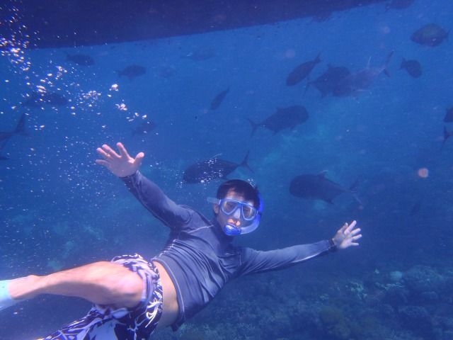準備できたら、小型ボートで出発♪水深1〜2mでサンゴたくさんあるポイントでは素潜りをさせてれました!ニモがたくさんいましたよ笑!2ポイント目は島の付近なので、さっきとは別世界で私達はウミヘビを見れました!3ポイント目はマグロのような大きな銀のお魚の群れと一緒に泳げました!シュノーケル満喫★