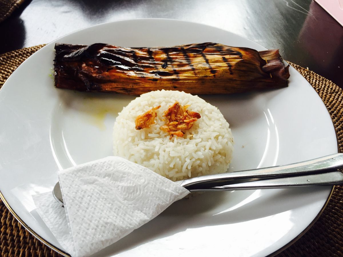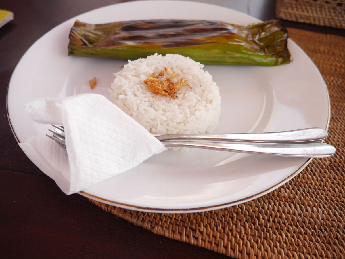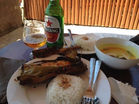 お昼は3種類の中から選ぶことができ、私は魚をバナナの葉で包んで焼いたものをいただきました。
