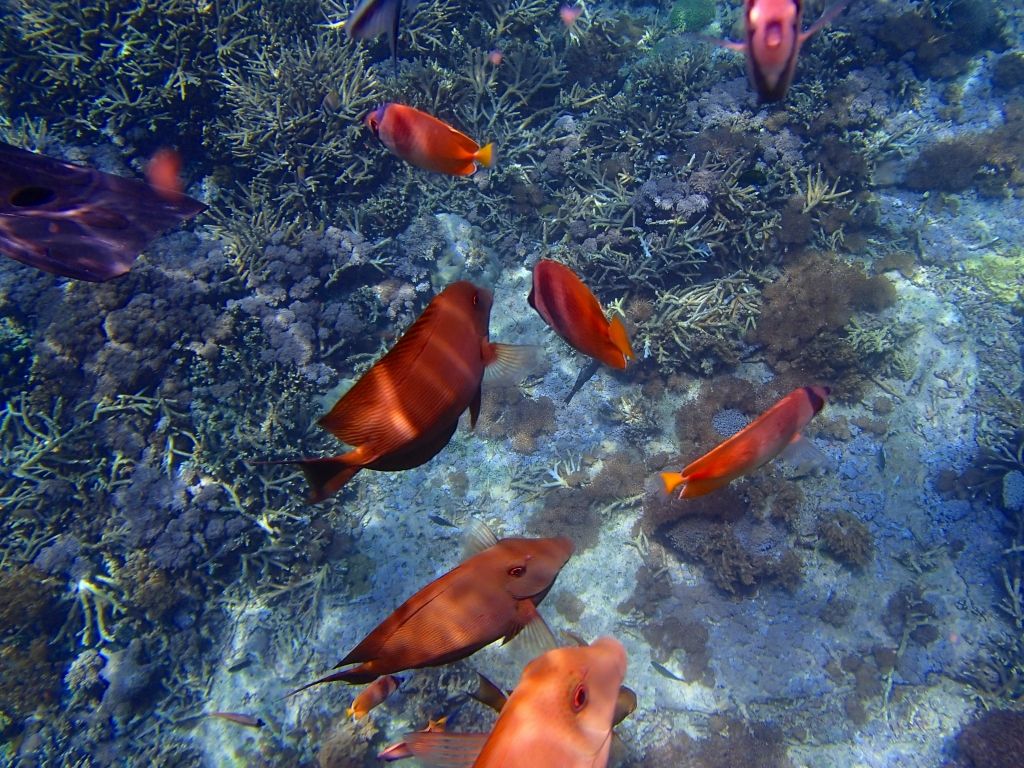 ボートで沖の方まで行き、現地のガイドさんと日本のガイドさん二人にサポートしてもらいながら30分ほど魚に餌をやりながら海に入りました。