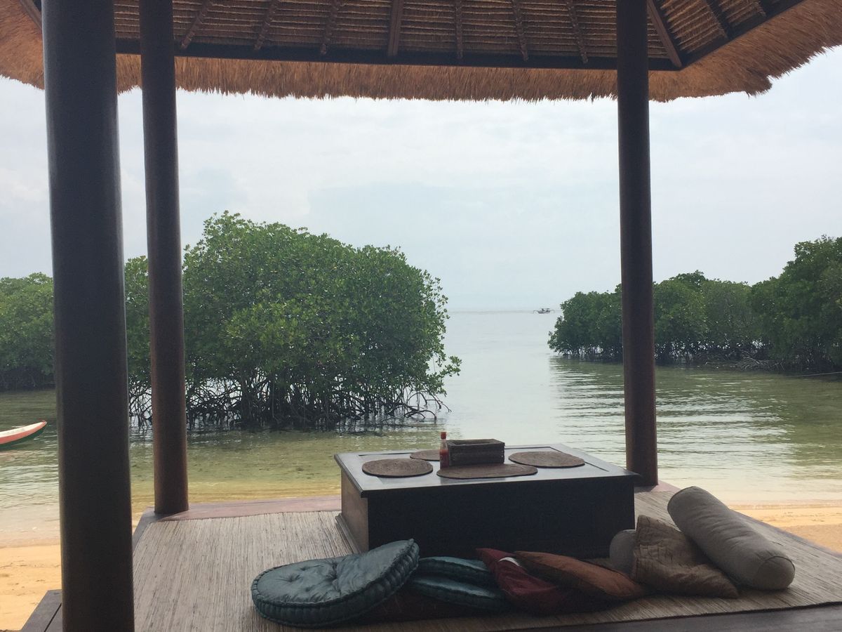 到着するとビラと東屋のある場所へ移動します。ここが海を目前にビーチチェアがあってノンビリしたいいところ。そこからまずマングローブを見に行きます。乗る船はモーター式ではなく、船頭さんが長いパドルで漕いでくれるので、マングローブの静けさが堪能できます。バリ中心地の喧騒とは離れた素敵な体験です。神秘的でリラックスできます。