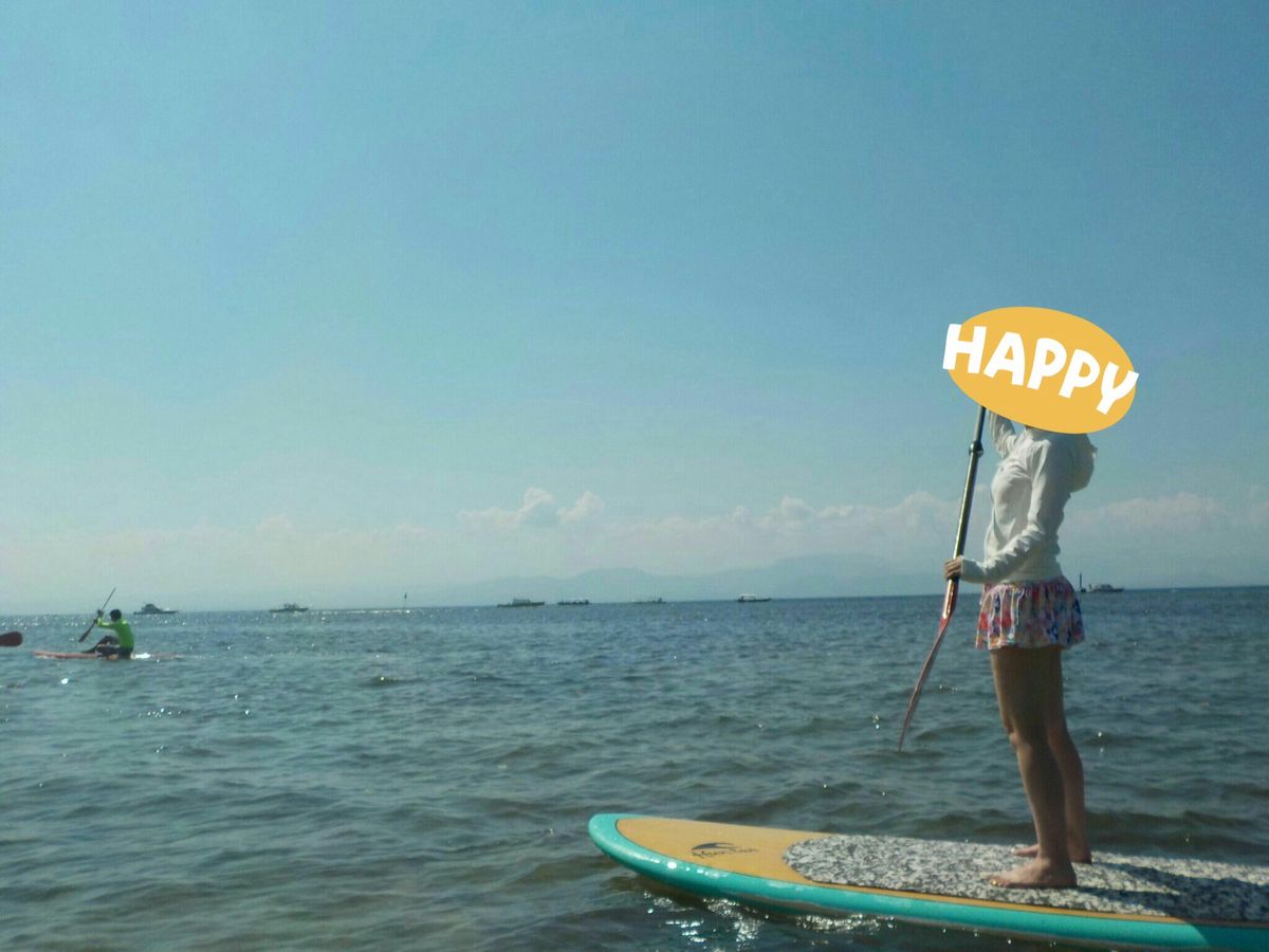 楽しみにしていたスタンドアップパドルは、運動音痴の彼女でもすぐに立つことができました。難しくても座って漕ぐことができます。