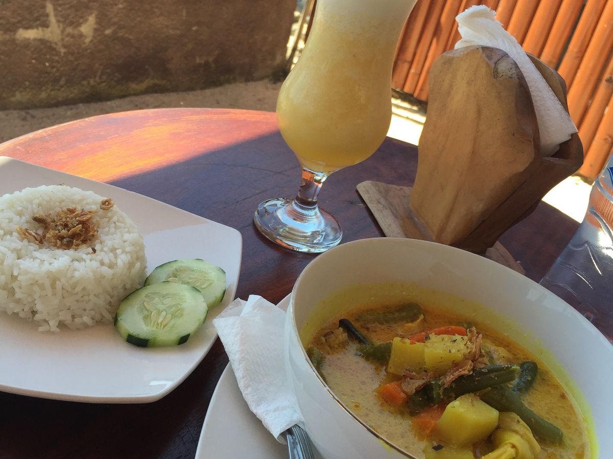 その後はランチタイム、私はココナッツカレースープ、子供はナシゴレン、そしてヤシの実ジュース(有料)。