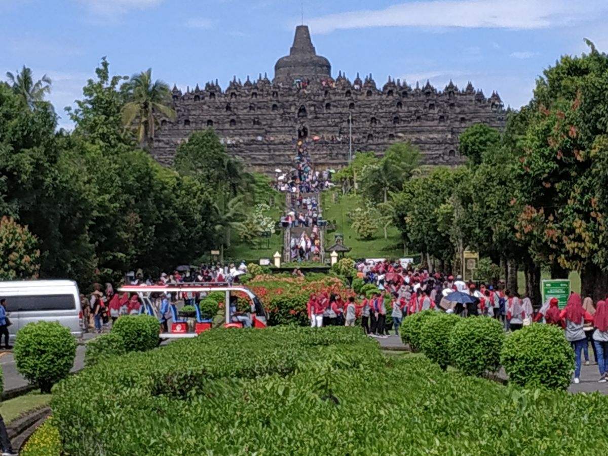 土曜の7:30ホテル出発で予約して、3〜4分過ぎくらいにガイドさんたち登場。8:45頃ボロブドゥールに着きましたが、その時点で、上まで登る整理券は11時でした。公園内を見るだけなら、すぐ入れるから外観だけ観たら?と提案されましたが、絶対上まで登りたかったので、周辺のパオン遺跡、ムンドゥ遺跡を見てから、10時過ぎに戻り、チケットを購入するも結構待たされて、結局出発できたのが、11:30ごろでした。昔は全員が上まで登れたので、全然待った覚えはありませんでしたが、今はみんなかなり長時間待たされている感じです。遺跡を守るためには仕方のないことではありますが、もう少しオペレーション上手くできないのだろうかと思いました。