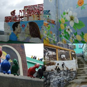現地に着いてまず驚いたのが景観の異様なことです。山肌に立ち並ぶ家屋はカラフルにカラーリングされ、入り組んだ路地のあちこちにはアートオブジェが並び、ユニークで珍しい景色を楽しめる趣向です。
