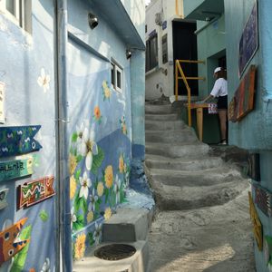 釜山は山に囲まれた港町なので、山の斜面に多くの家が建てられています。このような山の斜面にある路地集落の一つが、甘川洞文化村(カムチョンドンムナマウル)です。釜山のマチュピチュと呼ばれる観光スポットとなっています。遠くからカラフルな色で塗られた家屋が、山肌にぎっしりと立ち並ぶのが見えます。入り組んだ路地で形成されている集落です。路地のあちこちにアートオブジェや壁などに描かれたストリートアートが見られる芸術村です。坂道、階段、足元の不安定な場所も多々あるので、歩きやすい靴で行くことをお勧めします。