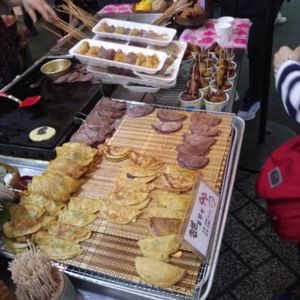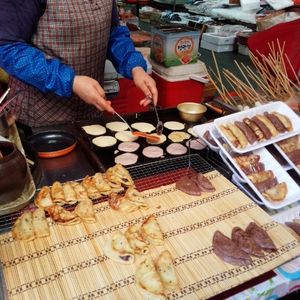 市場散策では、おすすめのチヂミとおでんを食べたり、