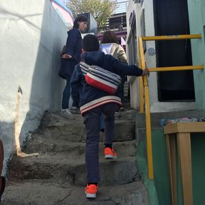 細い路地や急な階段を登ってアートな建物やディスプレイ、カラフルな色の壁や屋根の景色が