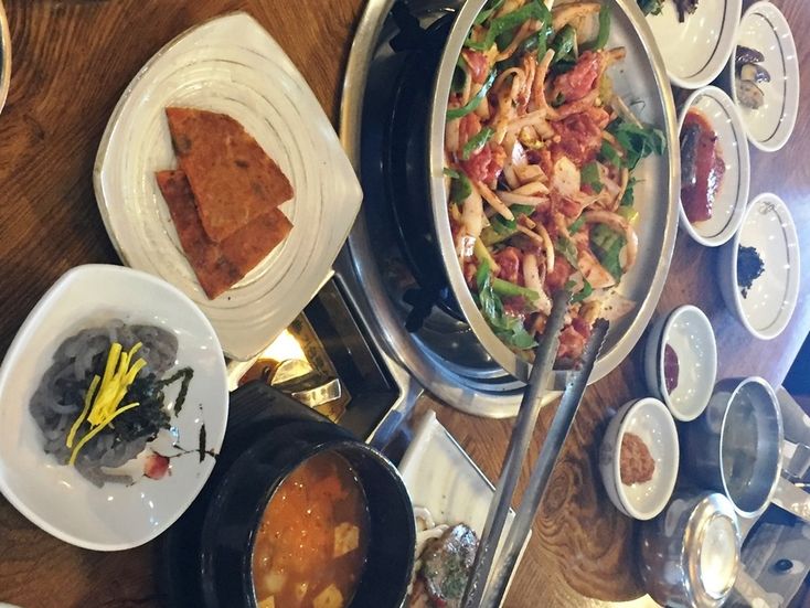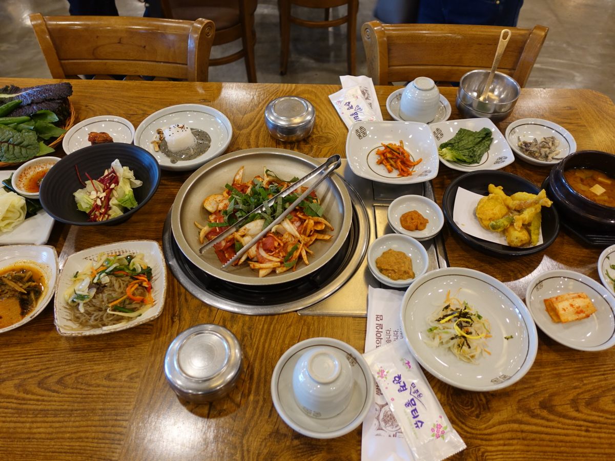 プルコギメインで、小さなおかずが食べきれない程広いテーブル一杯に