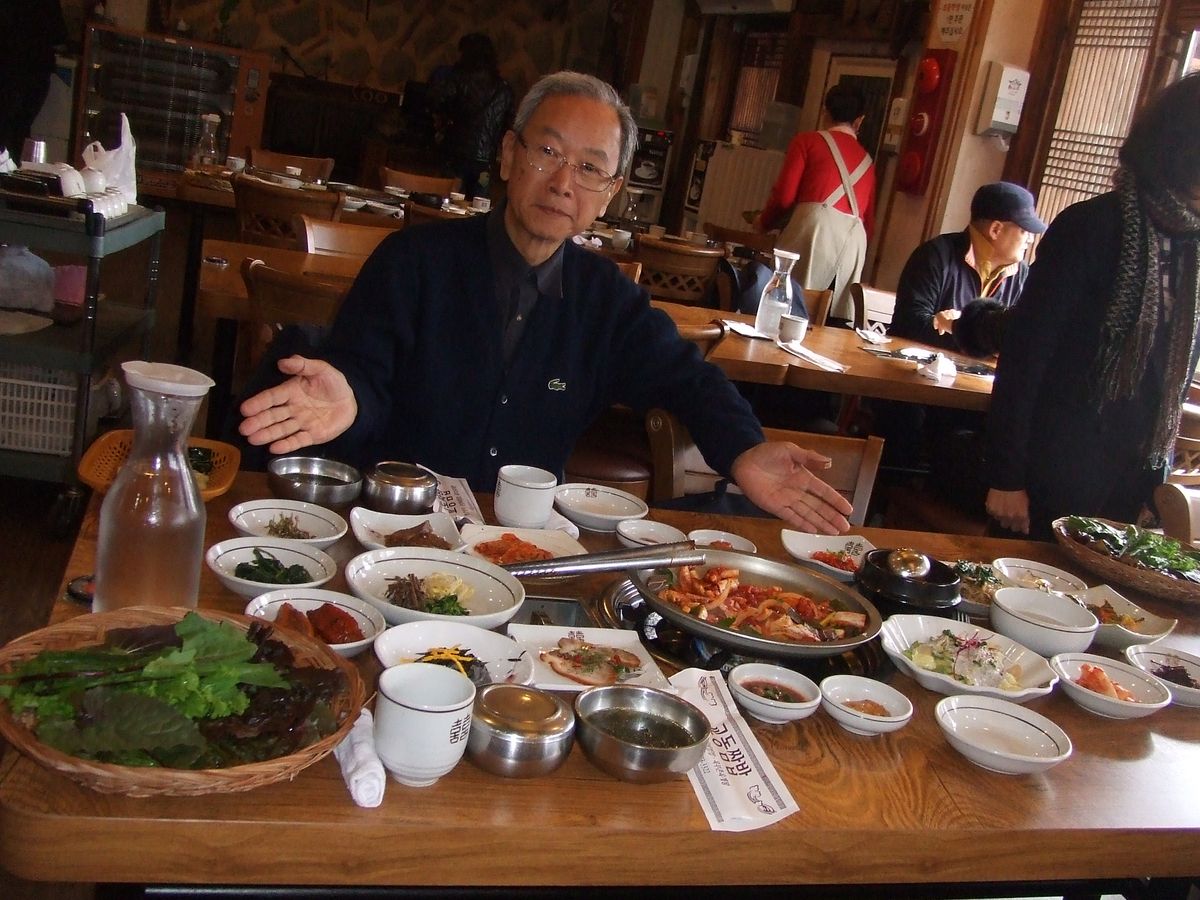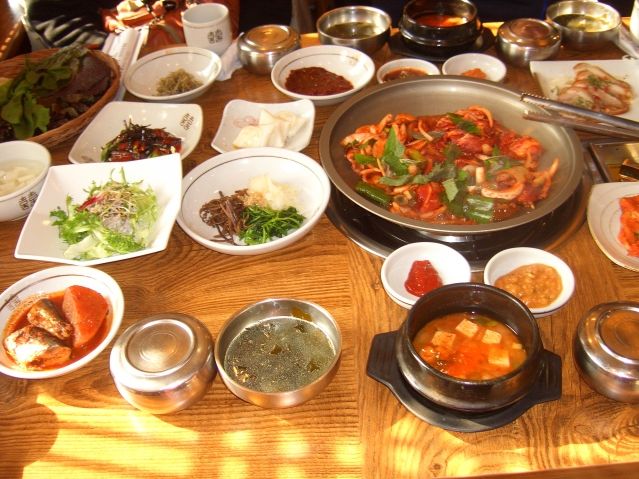 食事は、漢定食、野菜にご飯やプルコギや、色々なものを巻いて食べる食事葉、良かったです。口の中が辛くなっていたことろに、最後にいただいたかぼちゃのスープは、甘くてほっとしました。