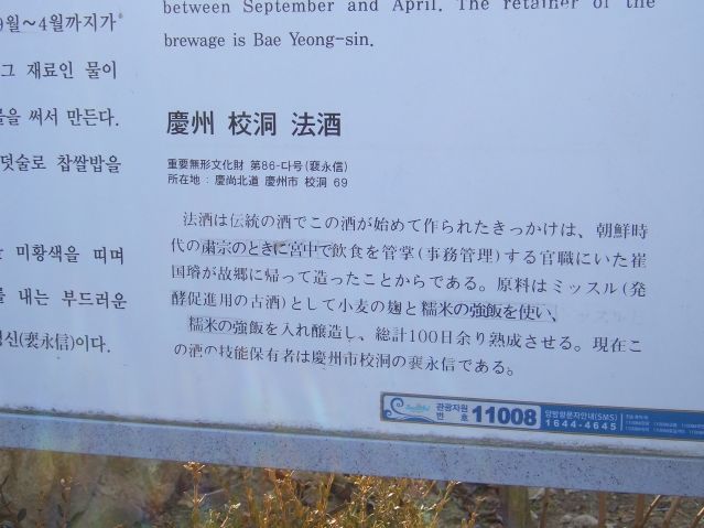 4月1日に世界遺産、慶州に行ってきました。友人とお互いの母を連れての、旅でした。ガイドさんが日本語がお上手で、細かいことまでわかりやすく説明して頂き、改めて慶州の素晴らしさを実感しました。昼食の時も何度も「美味しく召し上がっていただいていますか?」と聞きに来て頂き、(かなり美味しかったです。)その心遣いと美しい日本語には、頭が下がりました。校洞法酒も購入、ハルモ二にもお会い出来、素晴らしい一日でした。