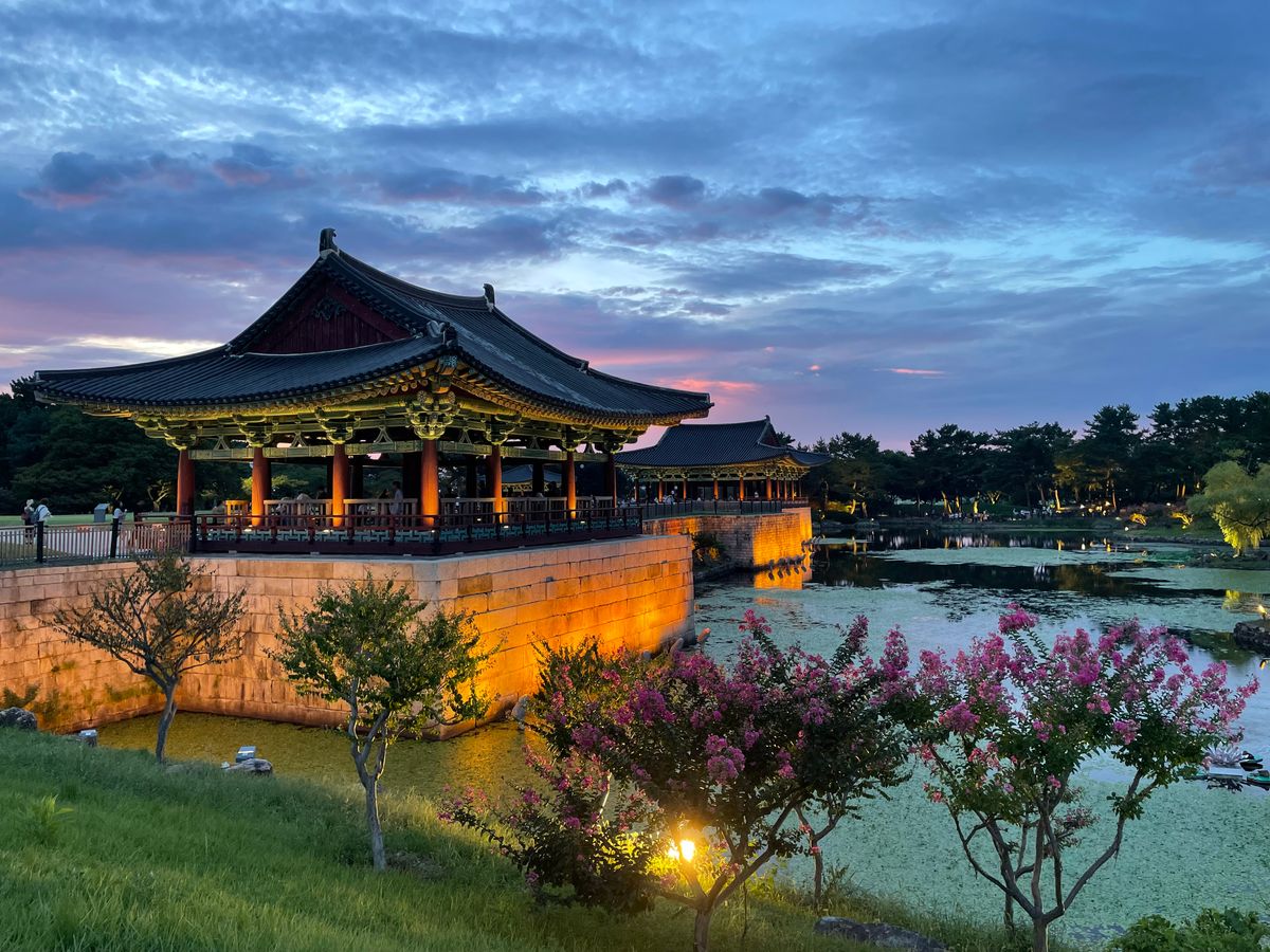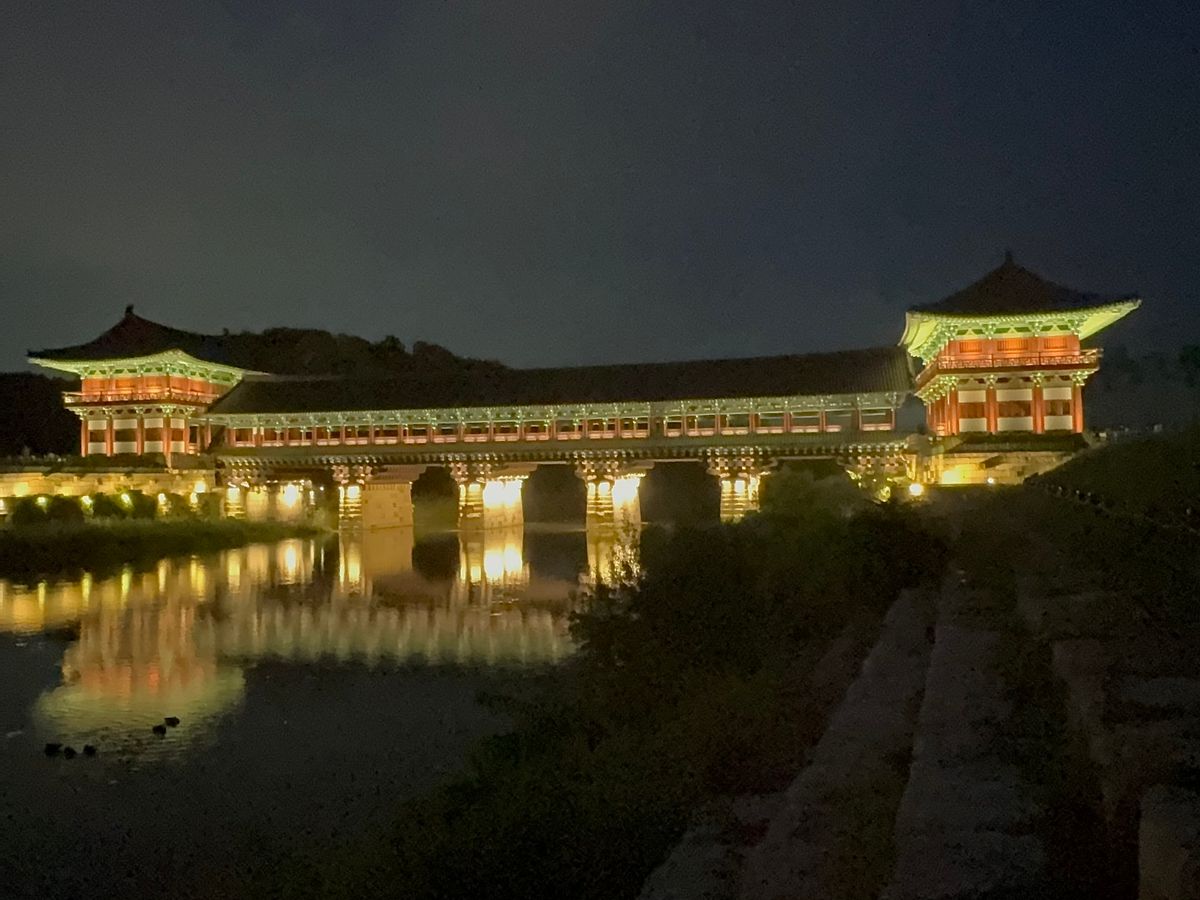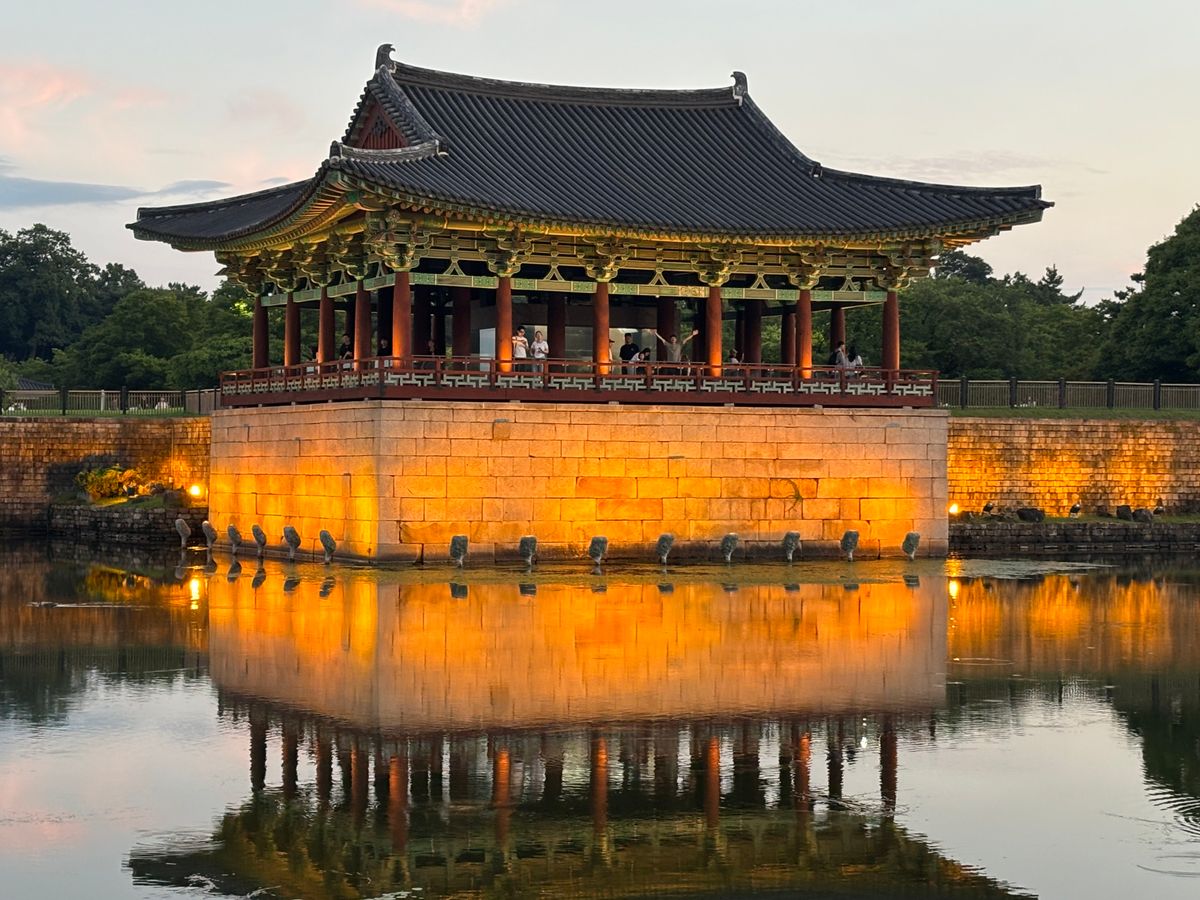 昼の観光で結構みんなぐったりしてしまい、夕方の月精橋と東宮は夏なので日暮が遅くライトアップの時間も遅かったため、もう写真のためだけに待つ、みたいな感じでした。
