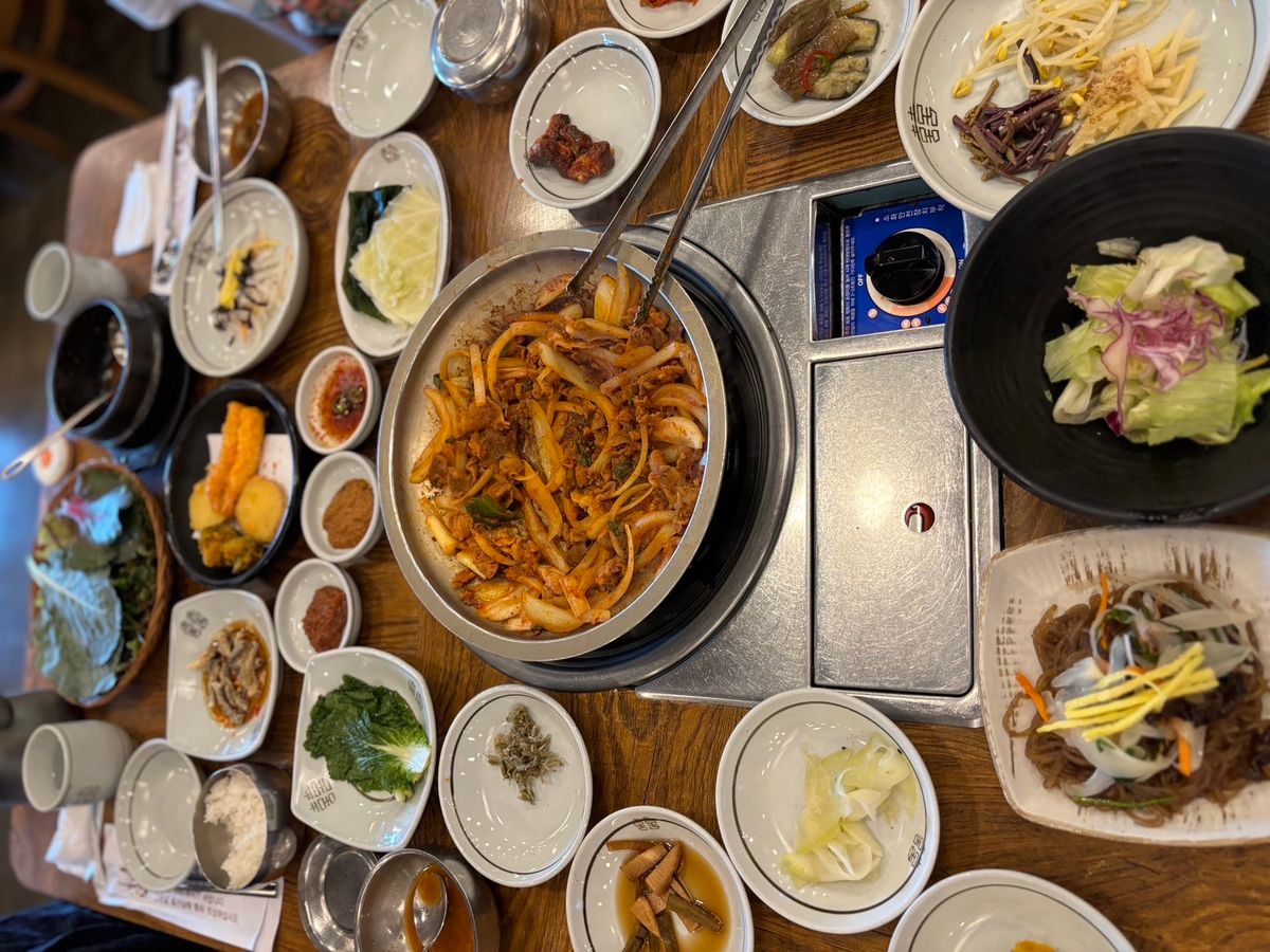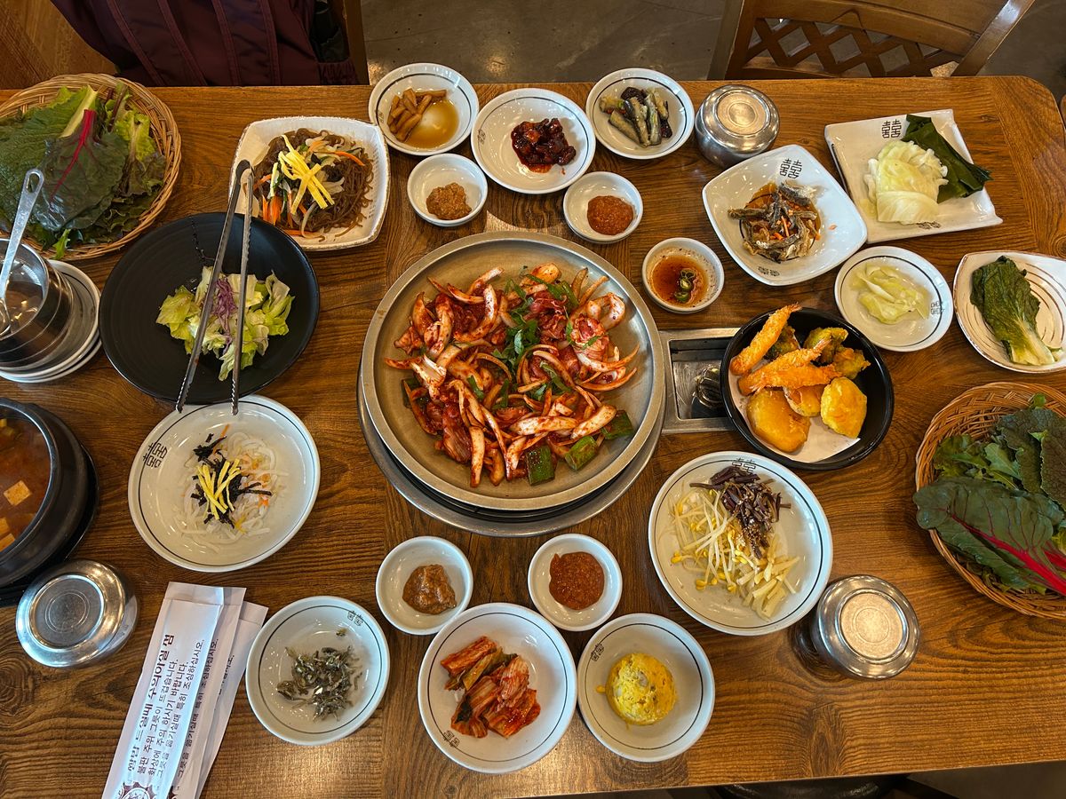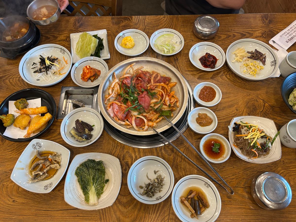 お昼ご飯は、豚のプルコギと様々なおかずを楽しめて、美味しかったです。鱈の皮を揚げたものや魚の甘辛い佃煮などあまり他では食べたことない料理も多かったです。