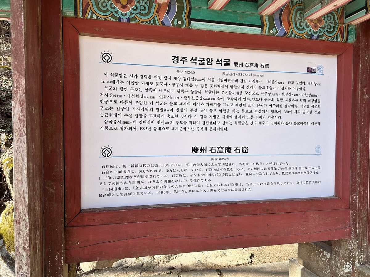 慶州の石窟庵の仏像と瞻星台に行けるツアーを見つけたので大いに期待して、日本から予約して行きました。三月初旬にいきなりの寒波到来で釜山市から警報がスマホに通知されるほどの極寒のなか、車で送迎付きで現地に向かえたのは良かったものの、雪が残る山道を歩いて登りましたが、服装も韓国の寒さに対応できておらず、ペラペラの秋物のパンツ履いてしまい、顔と膝が痛いくらいの突風が時折吹いて身体に堪える観光となりました。ガイドさんの日本語の説明があったので、いろんな歴史の話が聞けてその点はよかったです。もっと深く聞きたい部分もありましたが、ガイドさんの人生観や世界観もあるのか、ある部分ではあっさりした説明に終わるときもあり、好みもあるのでしょうね。寒かったのと渋滞に巻き込まれお昼が予定より大幅にずれ込み、身体が芯から冷えていたのですが、お店で用意していたランチの汁物が冷めてぬるかったのには閉口してしまいました。翌日帰国時に寒さと疲れからか朝から体調崩してしまいましたが、天候という不可抗力で仕方ないとは思います。春秋の良い時に是非行ってみてくださいね。のんびりした慶州の雰囲気に、いにしえの古代新羅の歴史を感じることができると思います。