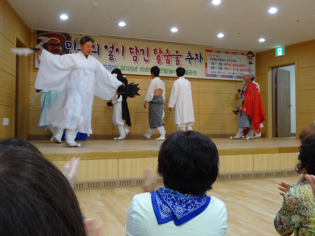 あいにく雨降りの天候であったため、仮面劇は屋外ではなく、室内で開催されましたが、十分楽しめました。また、河回村を歩き周りましたが、両班が庶民のことを思いやる姿勢や地方からの苦学生のための澹然齊の正門脇にある小さな口の説明を聞き、韓国人の度量の大きさを感じました。
