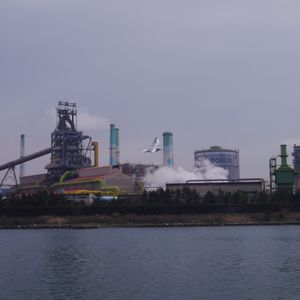 現代アート、韓国最大の製鉄所や世界一?の造船所を眺めながら船は進んでいきます。