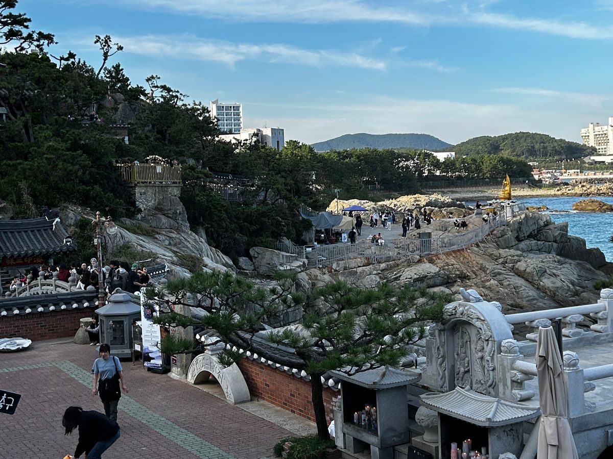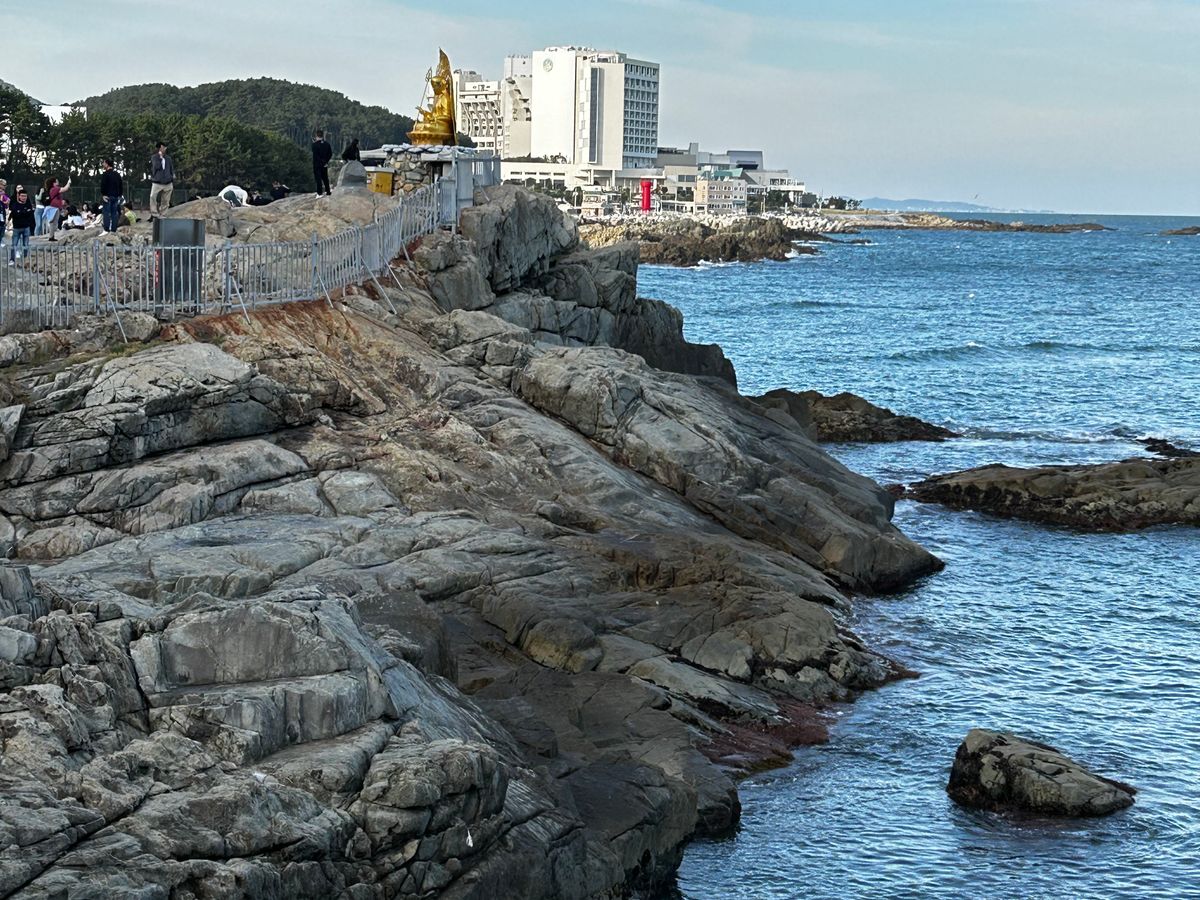 松島海上ケーブルカー→甘川文化村→海雲台→海東竜宮寺→梵魚寺 1日ツアーに出かけた。 ホテル午前9時発、朝ご飯はホテル近所のレストランが8時開店がほとんど。 仕方ないので、コンビニ飯。ロッテホテル待ち場所だった。まずは、松島海上ケーブルカーに乗って帰る。次は、甘川文化村。山の中腹に小さな長屋風の家が並んでいる。 朝鮮戦争で釜山まで北朝鮮に攻め来られて、トイレ、風呂無し、の長屋ができあがったようだ? 人気は道路脇に色々な萌スポットが点在している。 しかし、狭い道路に車が我が物顔で入ってくる。早々に昼ごはんはタコの炒めご飯が付いていた。後はお寺二軒。最後の寺は海東龍宮寺は韓国の修学旅行の生徒達と一緒で大混雑。人が多いは階段が平でなく歩きにくい。手摺もなく、順路も設定されてない、事故がないのが不思議、 安全対策を望む。しかし、バスツアーなのに、2万歩も歩いた。