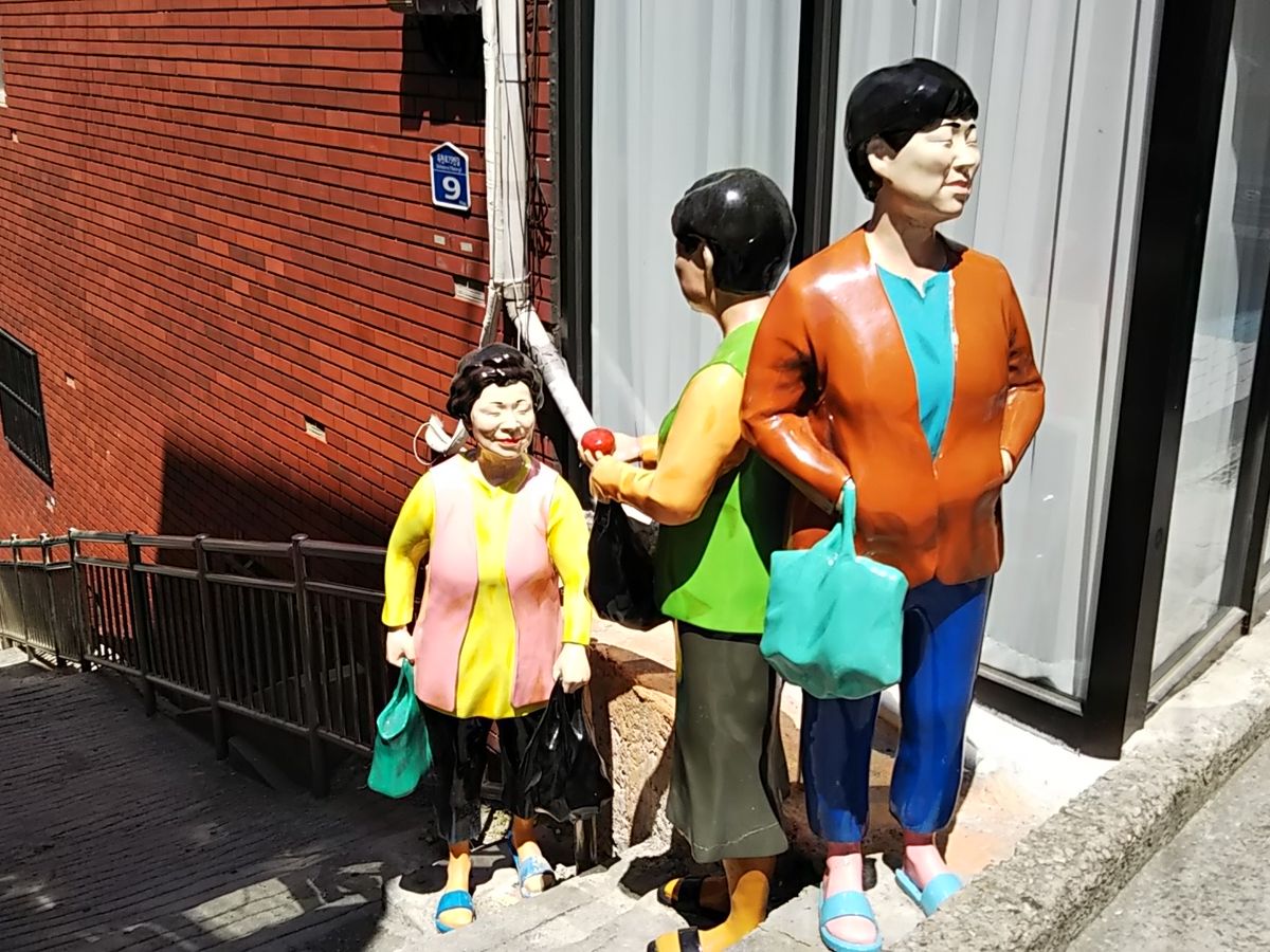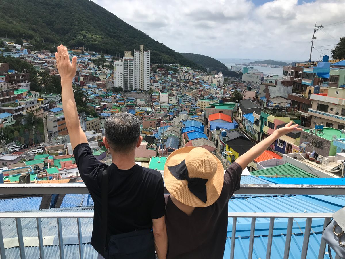暑い日でしたが、甘川文化村の景色はとてもよかったです。若い人が多かったのですが、ガイドさんが歴史についても語ってくださったので、興味深く散策を楽しむことができました。散策中、娘にLINEを送ったら、「きれい!!行きたい!!」と送ってきました。写真スポットが何か所もあり、夫婦で恥ずかしながら写真を撮ってもらいました。普段ならやりませんが、ガイドさんが上手に促してくれたのでたくさん撮れました。