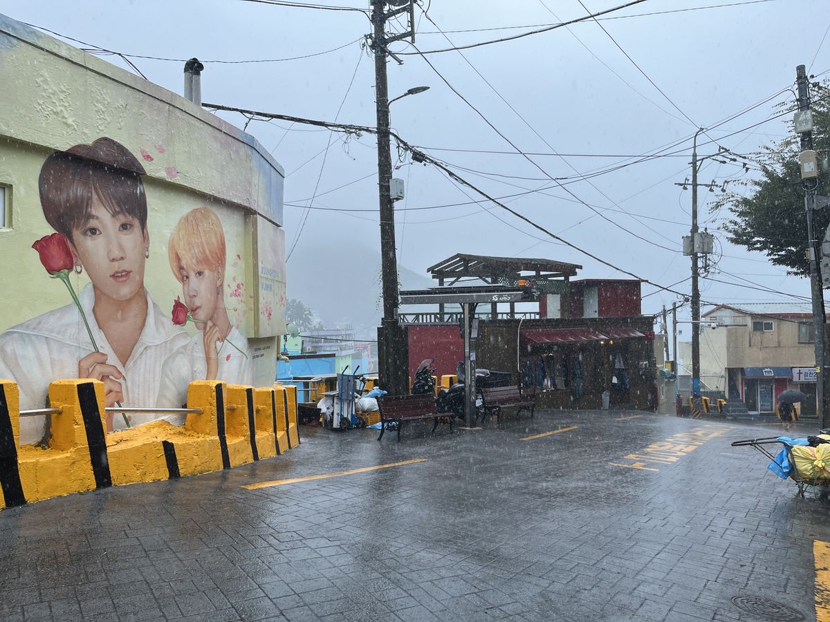 急な台風の進路変更で大雨、大荒れ。バケツをひっくり返したような大雨。びしょびしょでしたが人も少なく、ガイド金さんの機転、ウィット盛りだくさん。誰もみられない荒天の釜山を満喫しました♪
