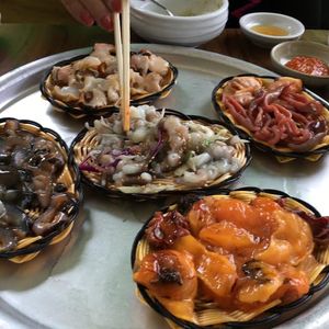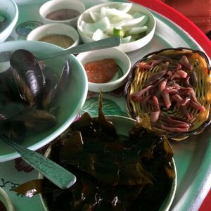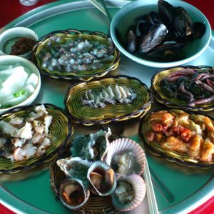 牡蠣もホタテも、ムール貝のスープ付きで頂きました。日本は、ワサビ醤油で頂きますが…韓国は、ほとんど、酢味噌で頂くみたいです。