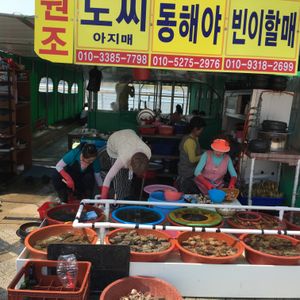 そこで、着いた所は、海女さんが取って来た、海産物が沢山、外に置いてある…お店に来ました。ここで、アワビのおかゆを頂くのね?…と、楽しみに、主人と降りて…お店に入りました。お店は、ビニールのテント?みたいな感じで、でも、ちゃんとストーブが置いてあり、暖かい所でした。