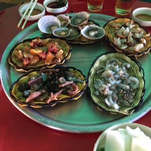 夫婦2組で参加しました。堤防のそばにアマさん達の小屋がありその中で食事ができるようになっていました。朝食のアワビ粥は行ってから作ってくれたので、新鮮でとてもおいしかったです。その他に別注文(現金払)で魚介類の盛り合わせKRW20,000を注文したのですが、その場で刺身にしてくれて、量もあるので4人でも充分満足でした。またビニール小屋の雰囲気が地元感が出ていて、おいしさ倍増でした。