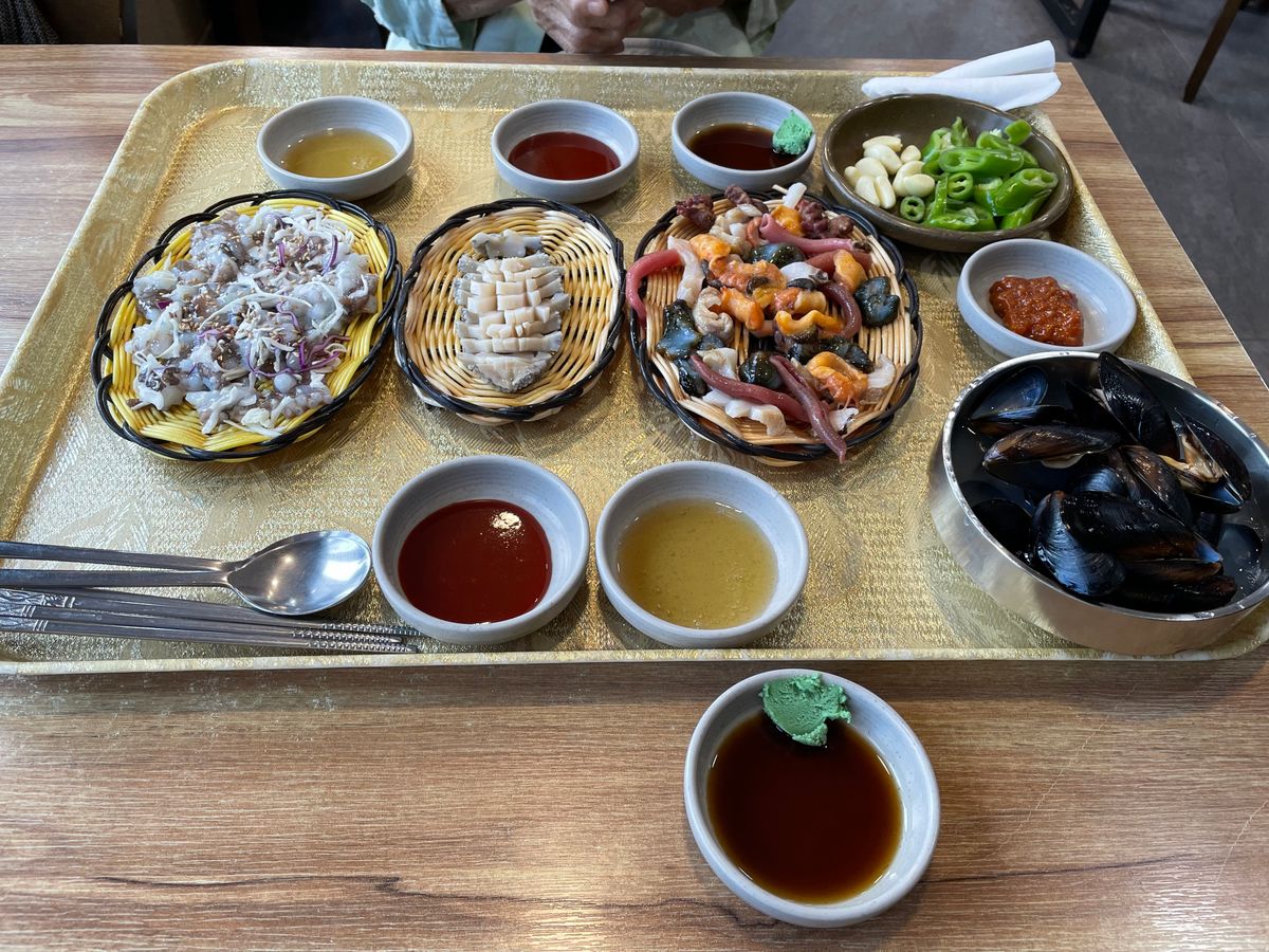 それと、ガイドの李さん(名前間違えてたらごめんなさい)にお勧めされた、貝のお刺身とタコの踊り食いサンナッチがセットになっている物を個人的に頼んだのですが、これがまた新鮮でとても美味しかったです!