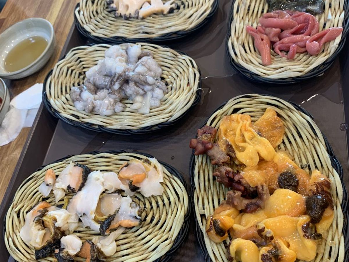 台風の影響で風が強く、残念ながら店内での飲食になってしまいました。しかし食べきれないほどのアワビ粥がとっても美味しくて大満足です。あとムール貝の韓国風ピリ辛蒸しも最高でした。追加で頼んだ刺身の盛り合わせは、動いているタコや、ユムシ、ナマコ、ホヤ等、日本では食べられないものばかりでとても楽しかったです。※子供にはトラウマだったようですが・・・