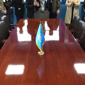 本会議場の中のテーブルではマイクのケーブルが国境線に沿って引きまわされていおり、その境界線に立って記念撮影が出来ます。つまり、左足が北側、右足が南側と言った格好での撮影が可能!