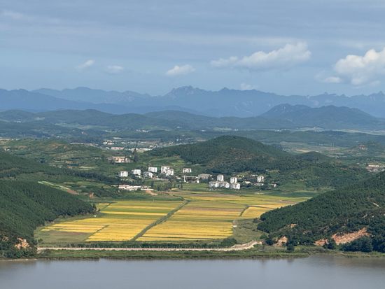 展望台では田畑の向こうに山々が見え、双眼鏡で見るとバイクや徒歩の北朝鮮の人達を見ることができました。