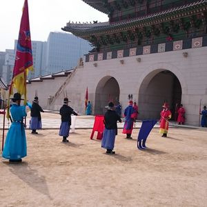 景福宮での交代式の直後は、突然「行きますよ~」とダッシュされて、訳がわからず一緒に走ったのですが(笑)、式に出ていた式典衣装の方と一緒に撮影ができるポイントに走ってくれて、おかげで並ばすに撮影してもらうことができました。説明もわかりやすく、親切でガイドさんには大満足でした。