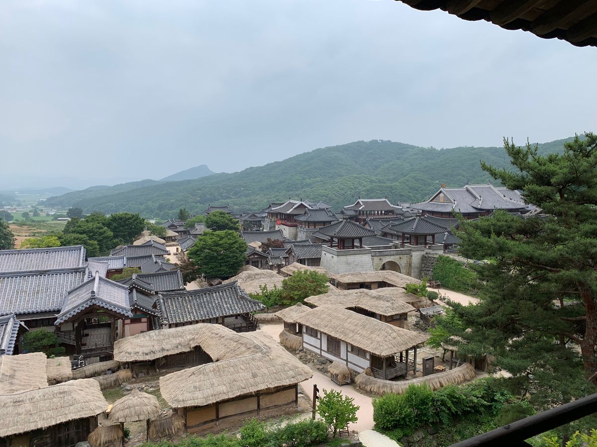 実は約四年前にも友人と訪れています。あの時もガイドはポギョンさん!ソウルを出発してすぐから、ソウルの街の情報、映画やドラマの話、俳優さんの裏話など到着までの1時間半余りを熱く語って下さりあっという間に目的地に到着。今回は歴史ドラマ好きの夫に撮影地を見せたくて再チャレンジ!ポギョンさんが用意して下さったドラマの場面の写真集を見ながら盛り上がる盛り上がる!前回無かったパーク内のバスで坂を登って行けるので、歩くのは下りだけ!これは最高❣️ポギョンさんの説明を聞きながらドラマの風景の中に溶け込んでいきます