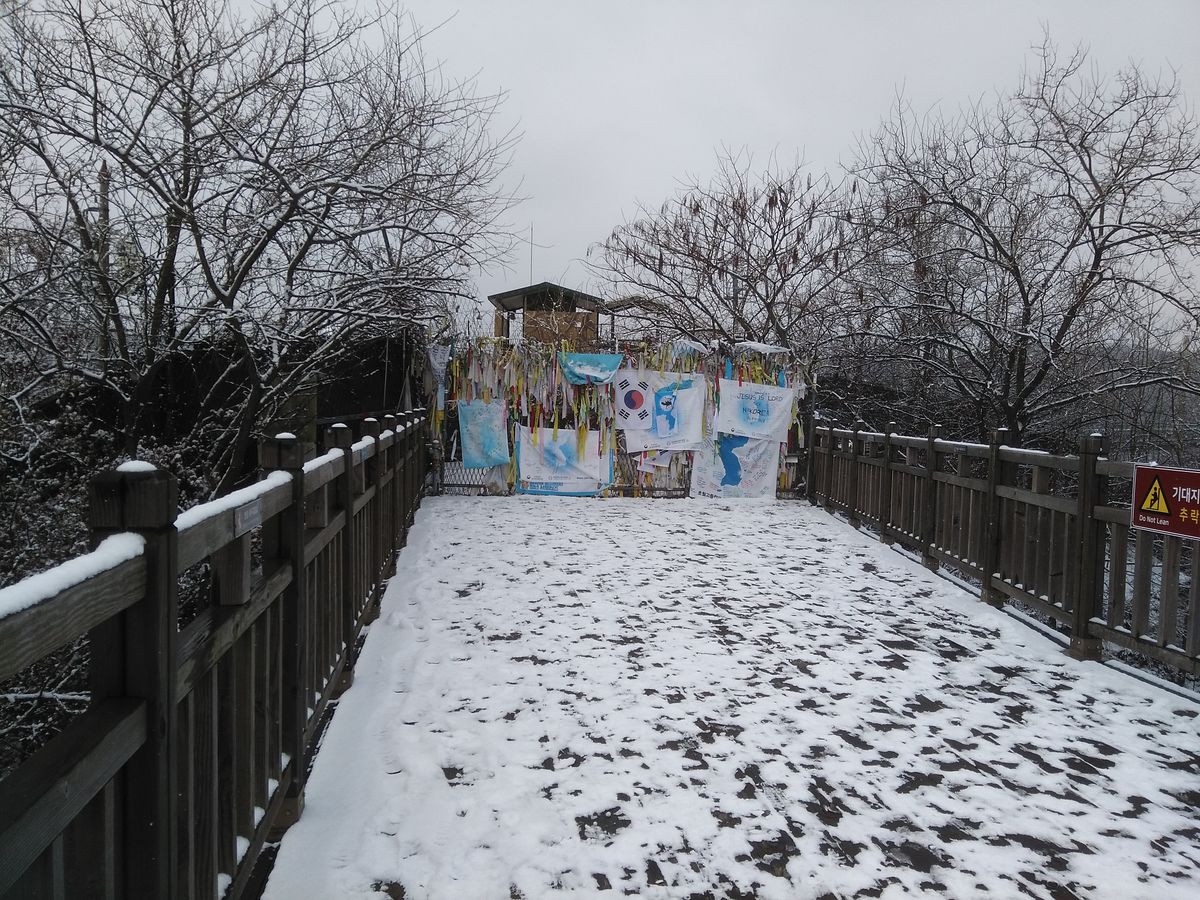 男2人旅行で今回の韓国ツアーで1番楽しみにしていたDMZツアー。朝起きてみると雪!
